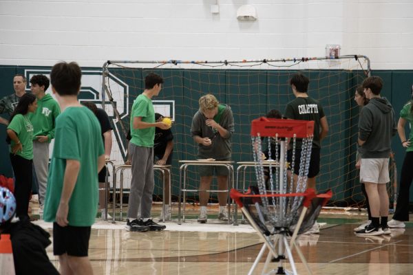 During the relay, students had to eat two donuts, land a spike ball in a disc golf target, scooter blindfolded through cones on the gym floor, shake ping pong balls out of a tissue box on their back, and finally run back to the beginning of the course.